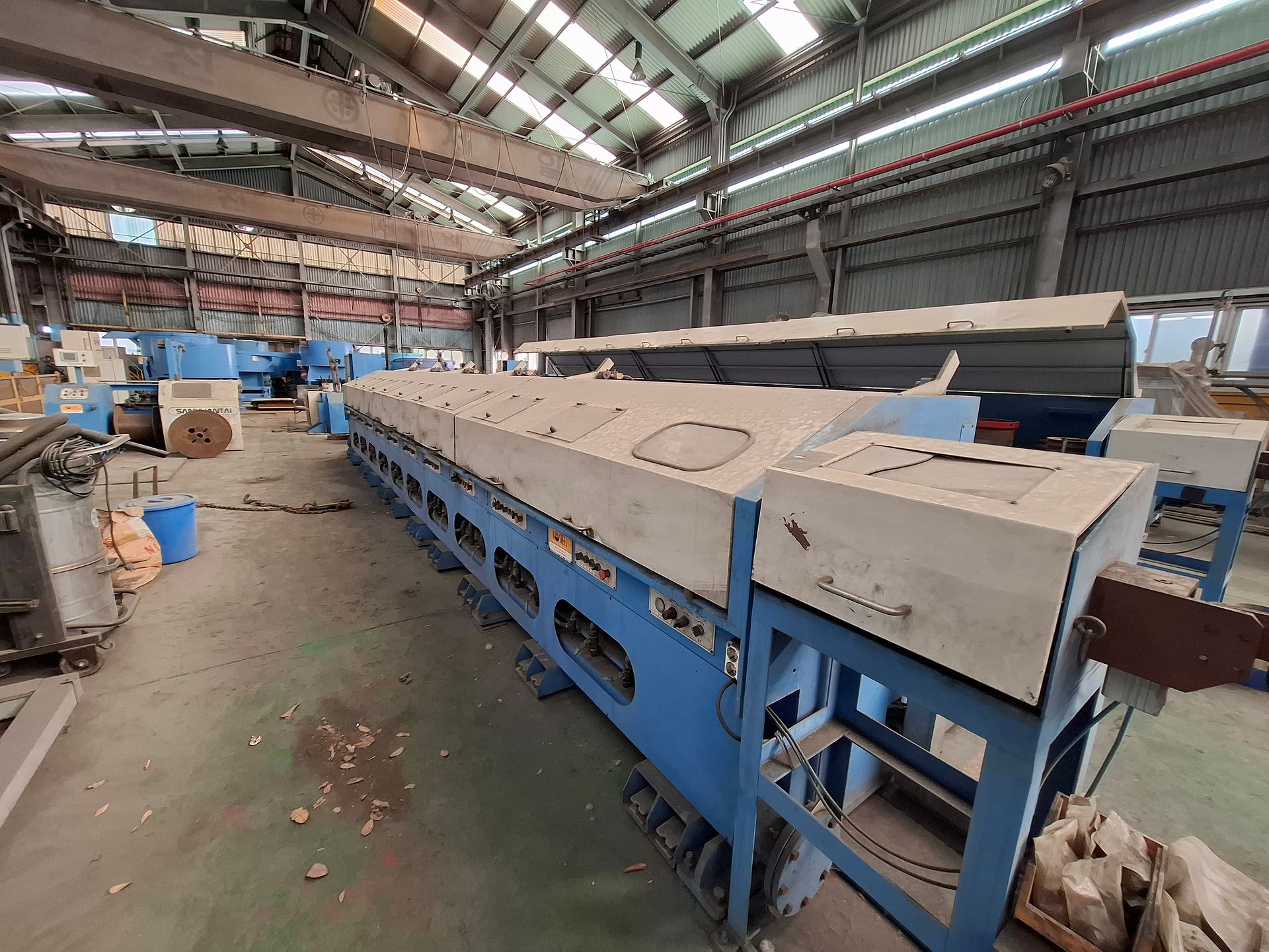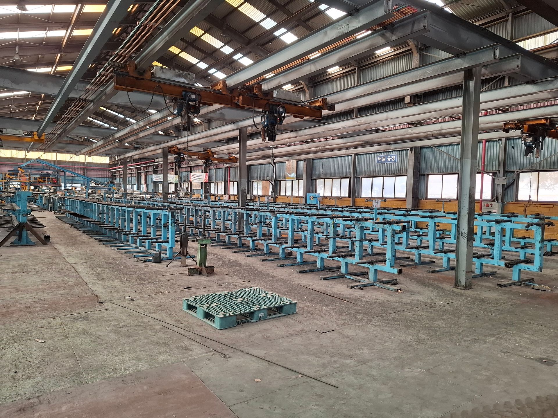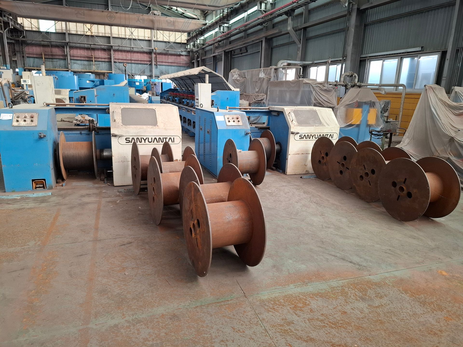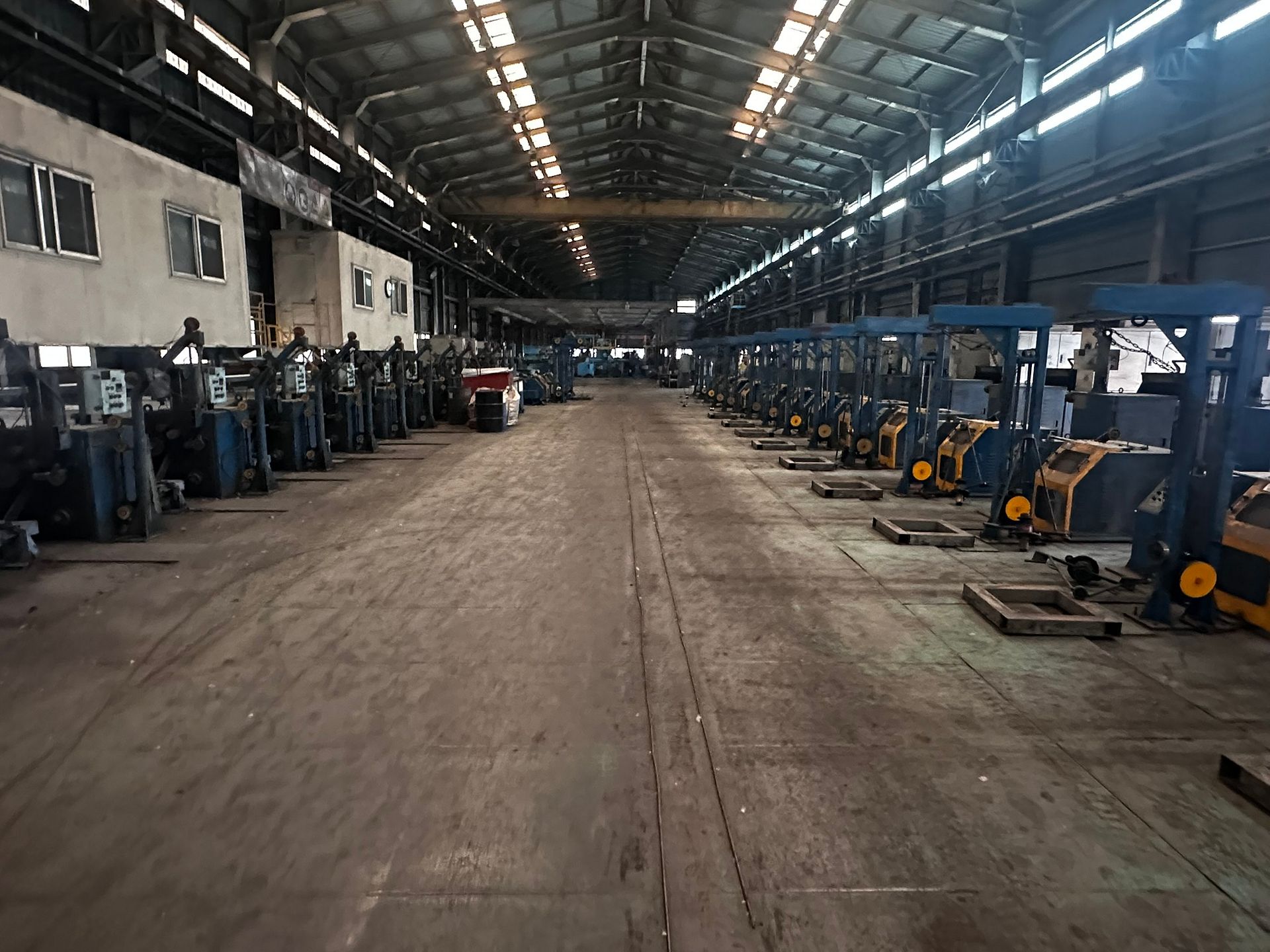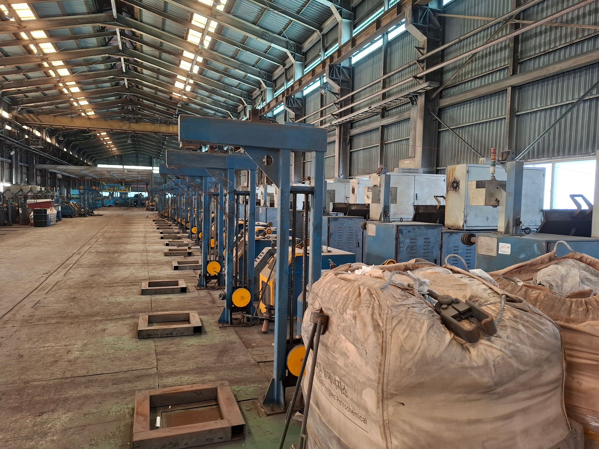 KOSteel production line for the manufacturing of its globally recognized BUNDREX® steel fiber, this facility integrates high-speed wire transformation systems with shaping and packaging. It includes dry and wet drawing machines capable of reducing carbon steel wire from 6.5 mm to 0.5 mm at speeds exceeding 1,000 m/min, followed by pointing, welding, rewinding, and modular fiber shaping units. Bundling and packaging systems complete the process, enabling industrial-scale output of reinforcement-grade steel fibers. Support equipment such as descalers, heat treatment units, tensile testers, and forklifts ensure full-cycle processing and operational autonomy.
