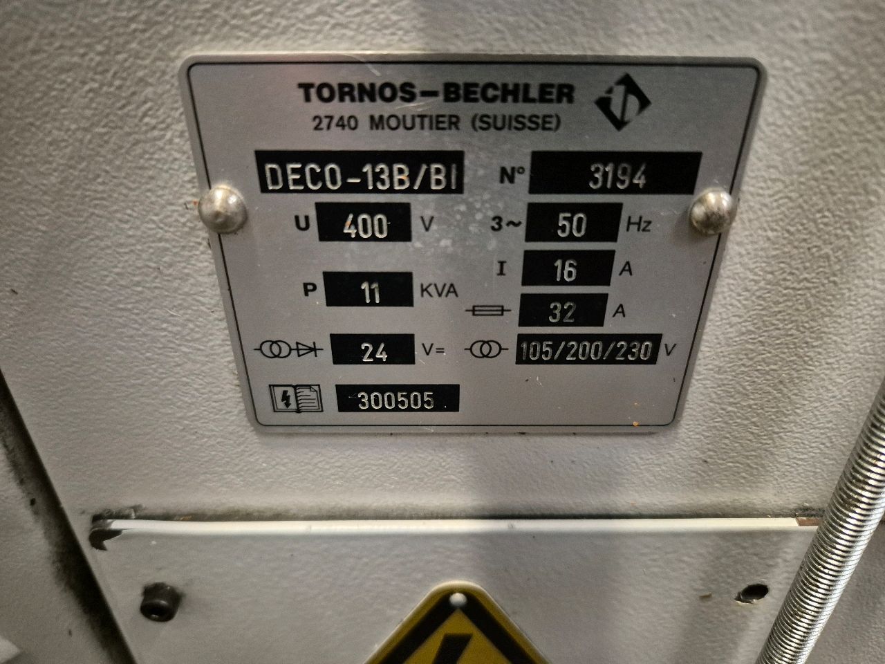 - maxi rod diameter: 13 [mm] - Parts maxi length: 160 [mm] - Spindle speed: 100 – 12,000 [rpm] - Positioned locking and switching device: 0.1° - Spindle power: 3.7 [KW] - turning tools on guide bushing: 5 - Tools cut: 12 x 12 - Number of possible powered tools: 3 - Driven tool speed: 100 – 8,000 [rpm] - Power of driven tools: 1.1 [KW] - Number of tools on the combined device: 3 - Counter spindle tension max capacity: 13 [mm] - Counter spindle rotation speed: 12,000 [rpm] - Counter spindle power: 2.2 [KW] - Number of counter operations: 3; - Dimensions: 1,100 x 7,270 x 1,950 [mm] - Weight: 3,000 [kg]; YOM 2001, Serial 3194