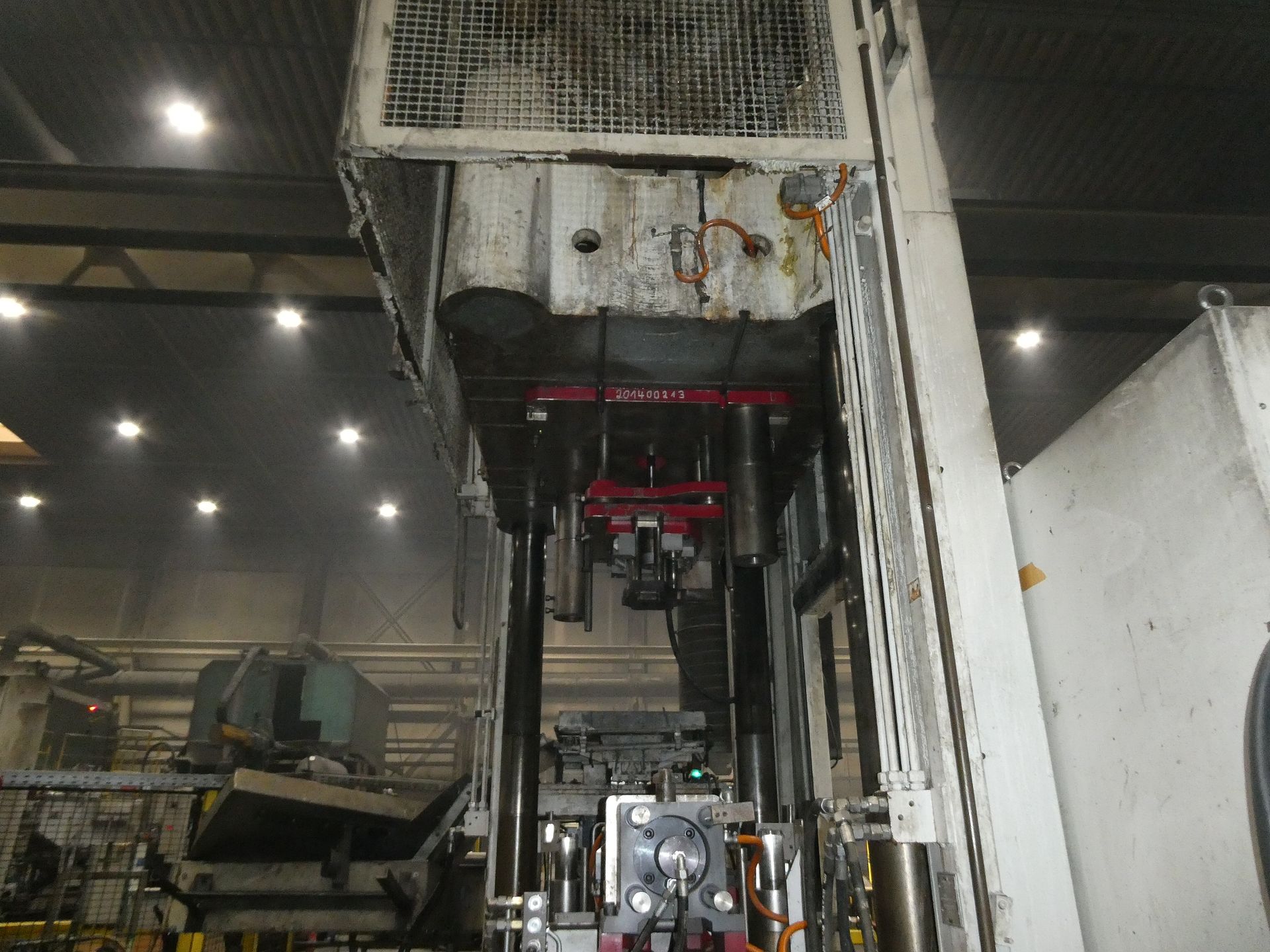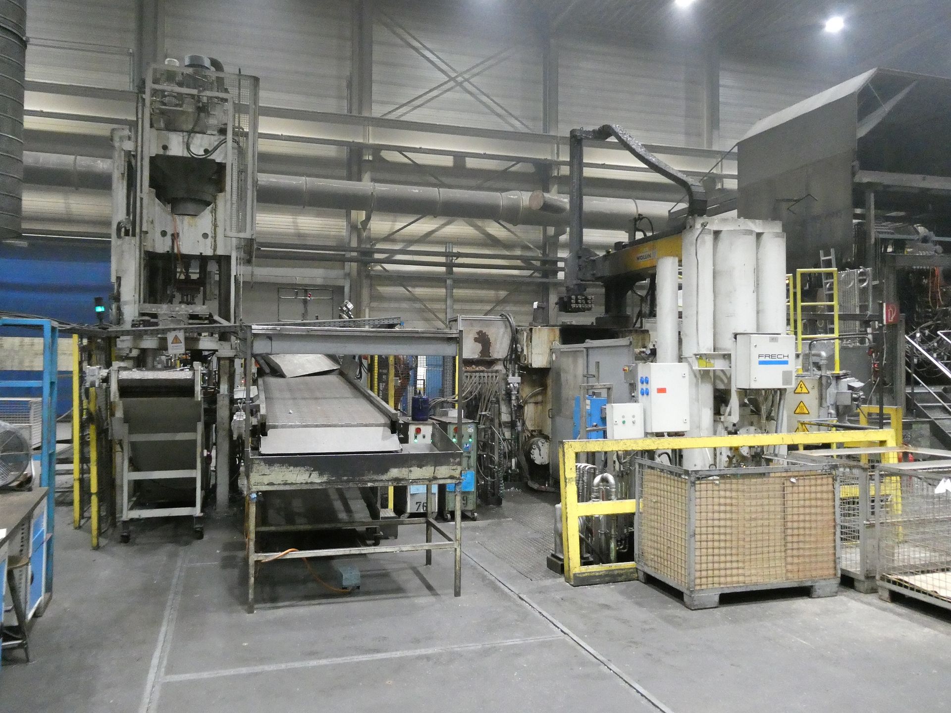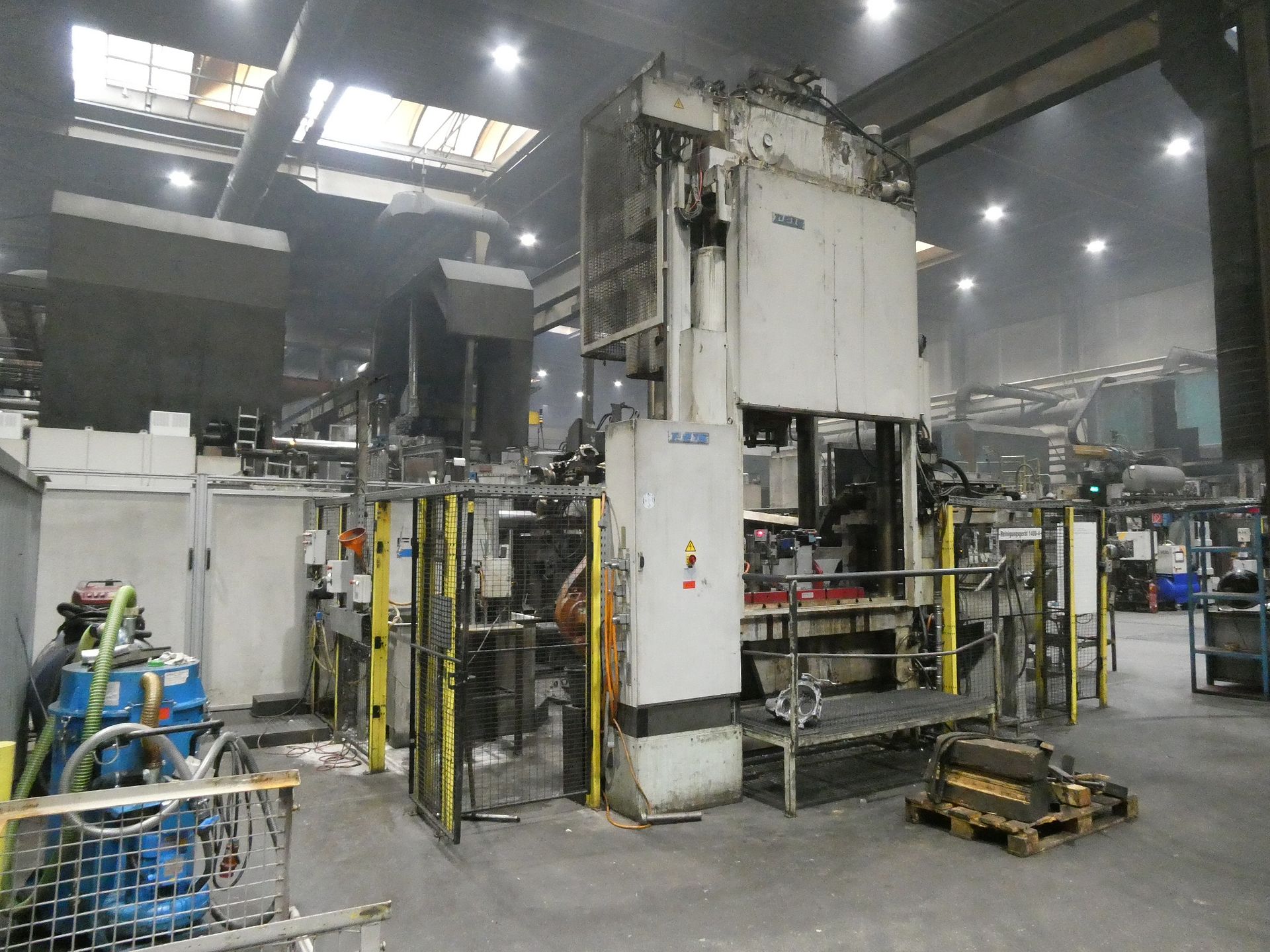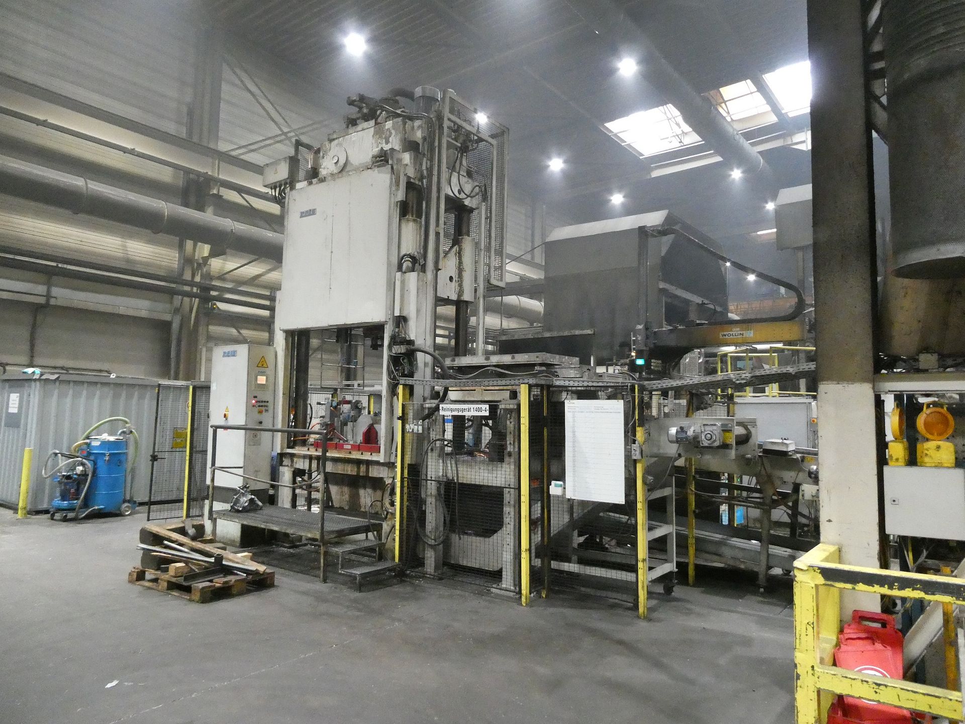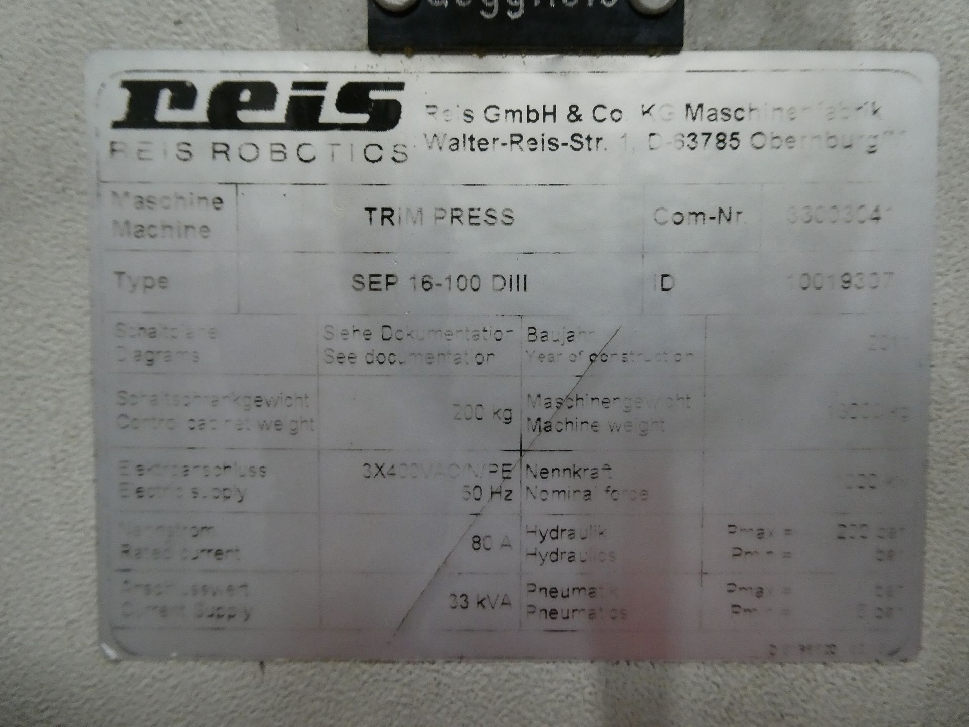 Description: Net weight 13,000 kg, nominal force 1,000 kN, pressure max. 200 bar, min. 5 bar, output 33 kVA, control dialog, 2 conveyor belts, protective fencing, safety device
