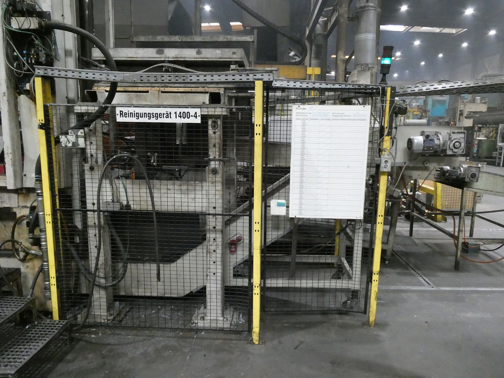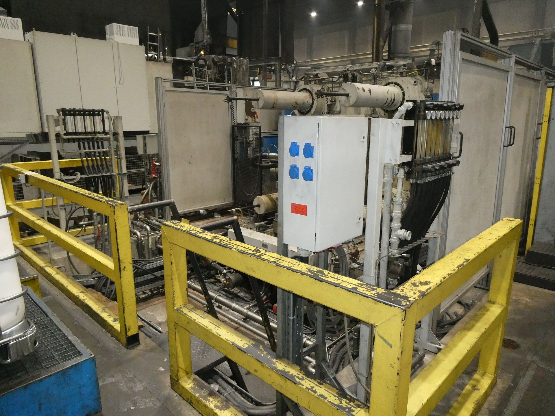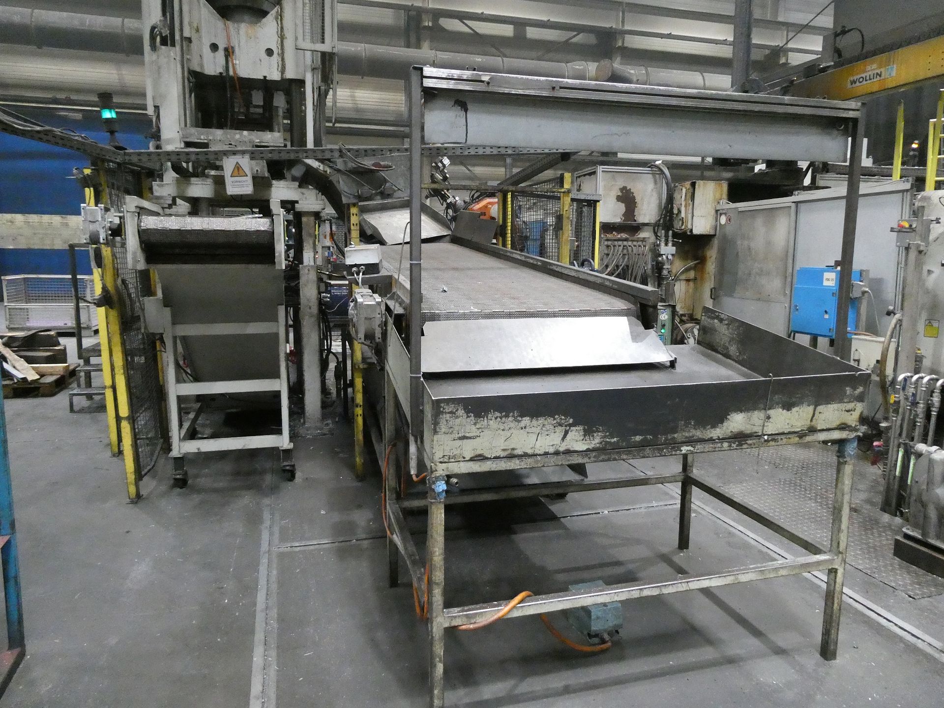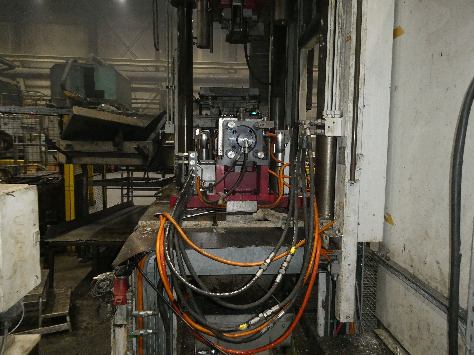 Description: Net weight 13,000 kg, nominal force 1,000 kN, pressure max. 200 bar, min. 5 bar, output 33 kVA, control dialog, 2 conveyor belts, protective fencing, safety device