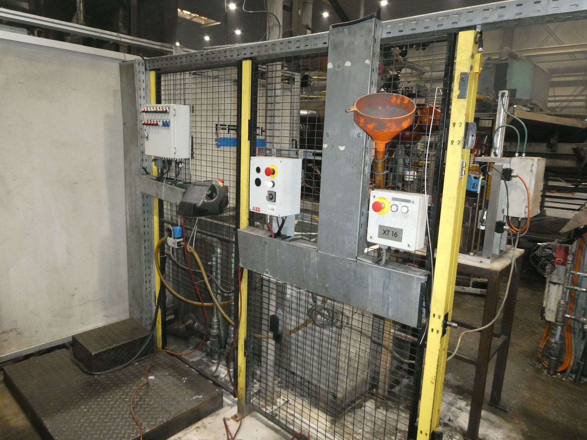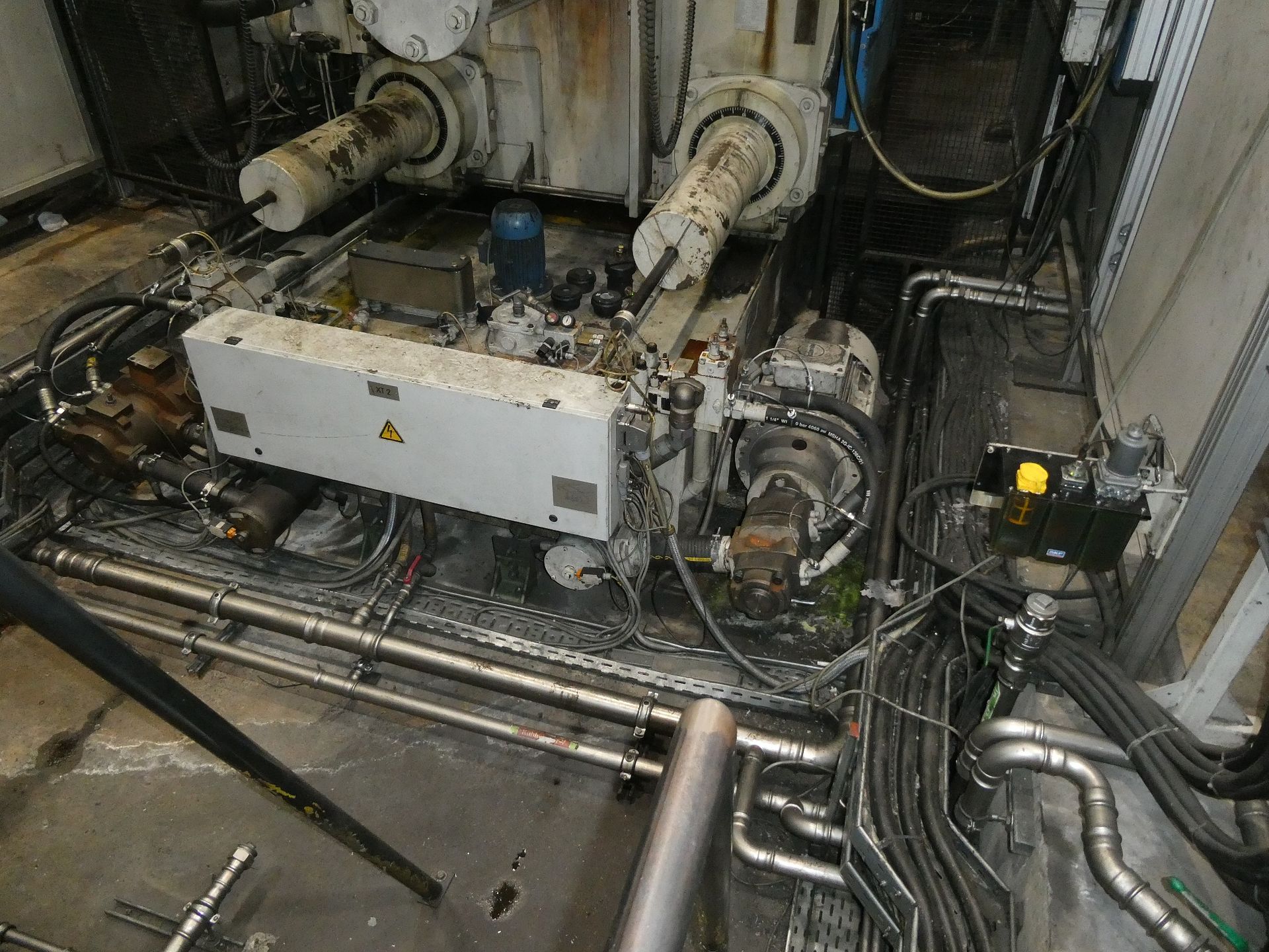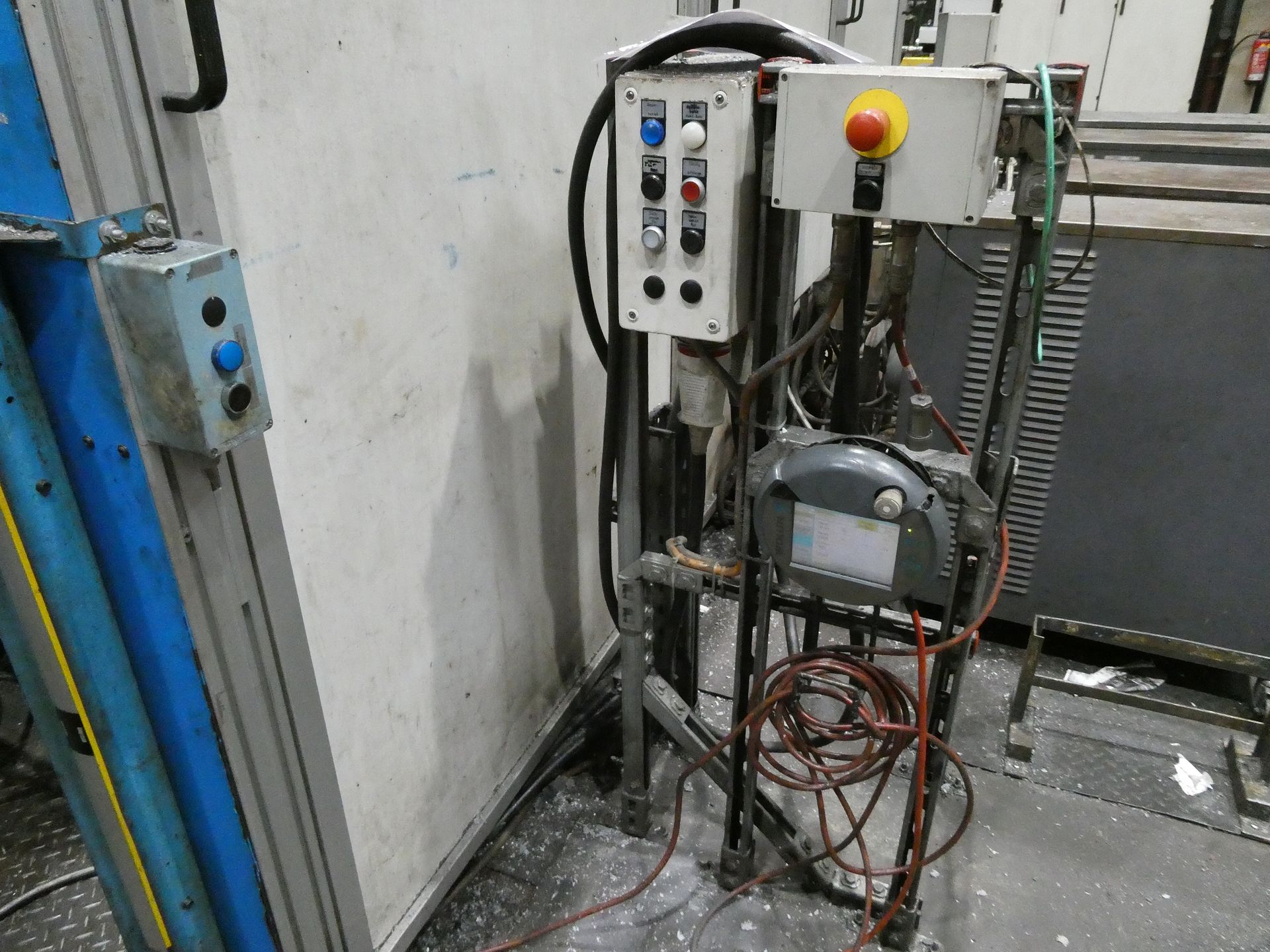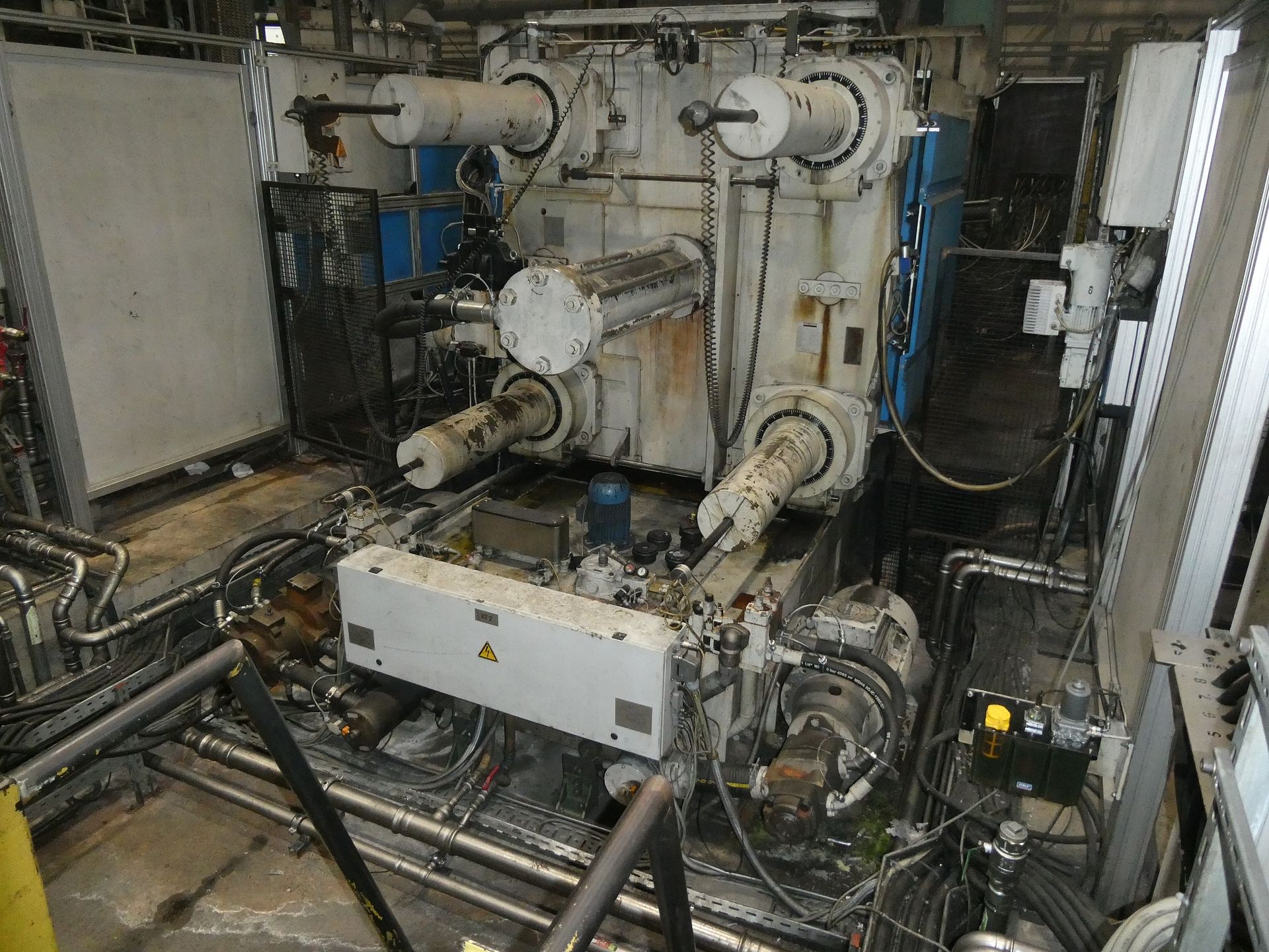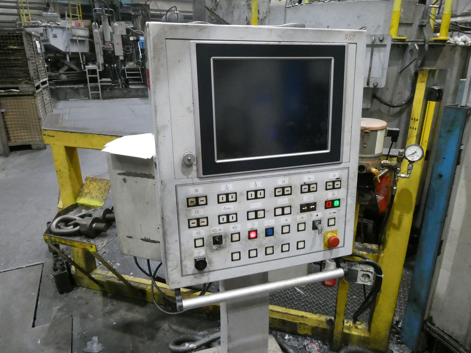 Description: Net weight 13,000 kg, nominal force 1,000 kN, pressure max. 200 bar, min. 5 bar, output 33 kVA, control dialog, 2 conveyor belts, protective fencing, safety device