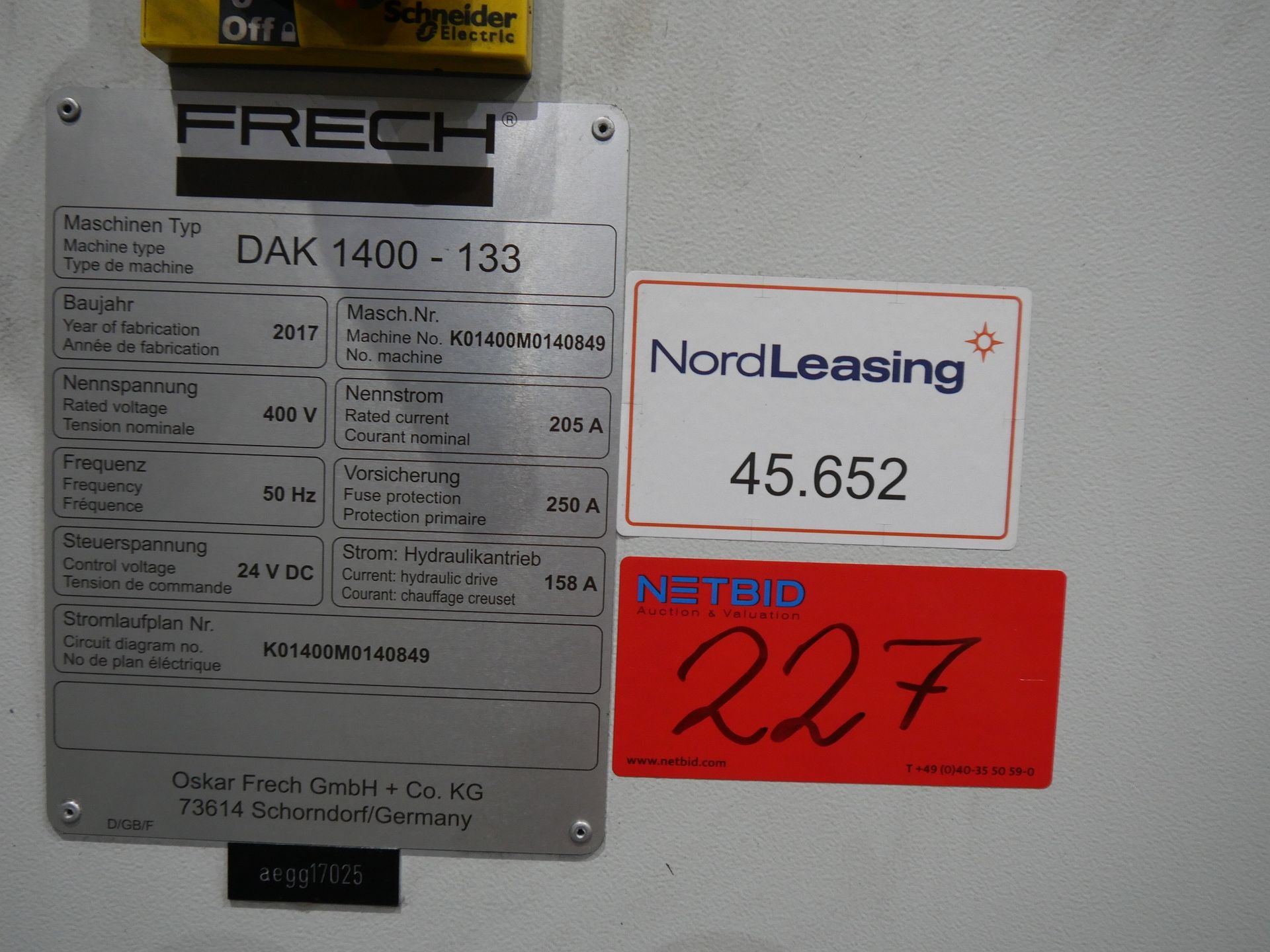 Description: Nominal voltage 400 V, frequency 15/60 Hz, nominal power 13 kW, nominal current 18 A, machine weight 1,000 kg, system control, Mfg. Meltec