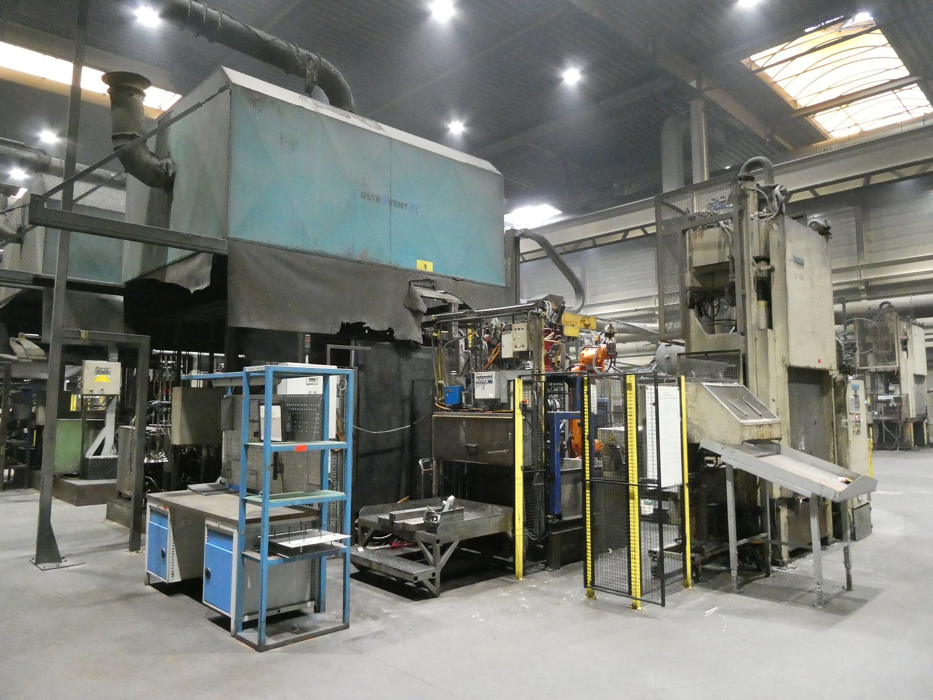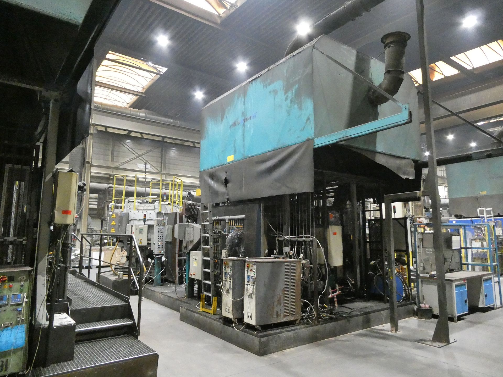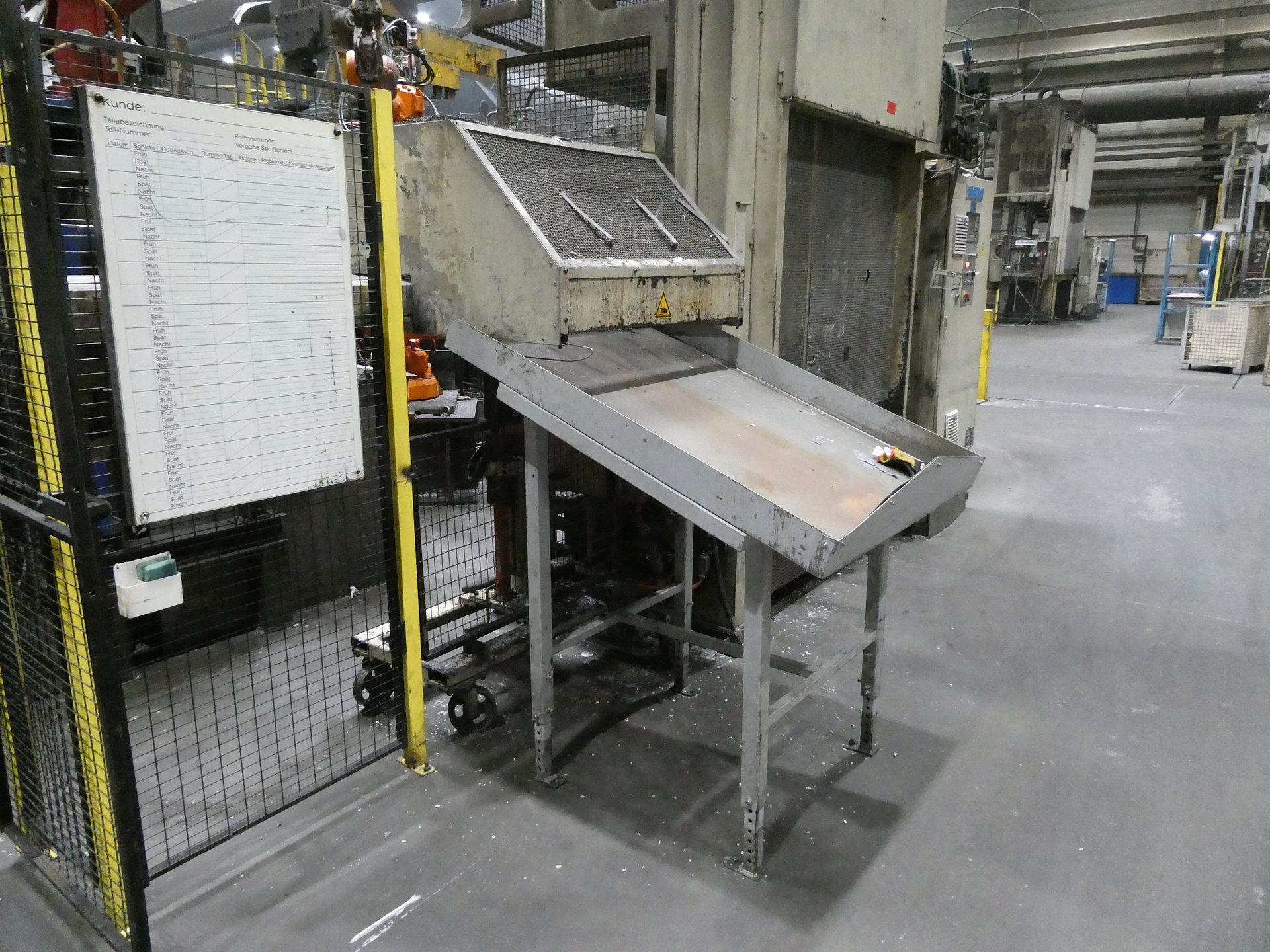 Description: Net weight 8,500 kg, nominal force 650 kN, pressure max. 200 bar, min. 5 bar, connected load 27 kVA, control dialog, conveyor belt, protective housing, safety devices