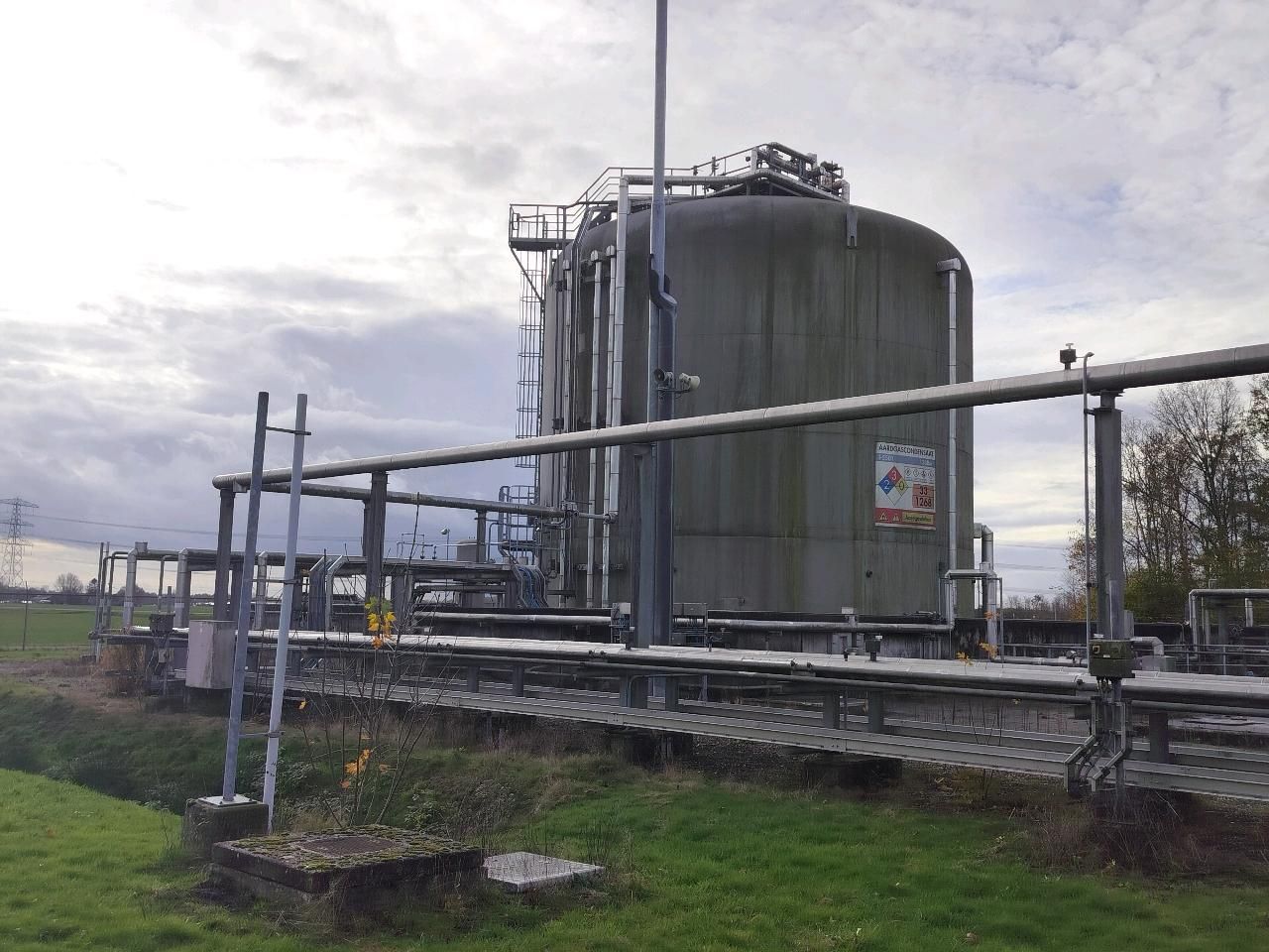- Large vertical cylindrical steel tank with insulation (or coating remnants)