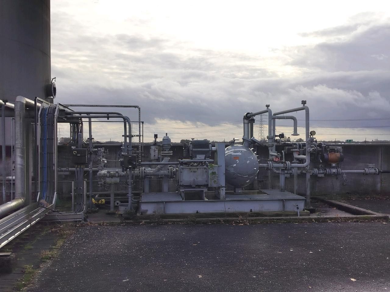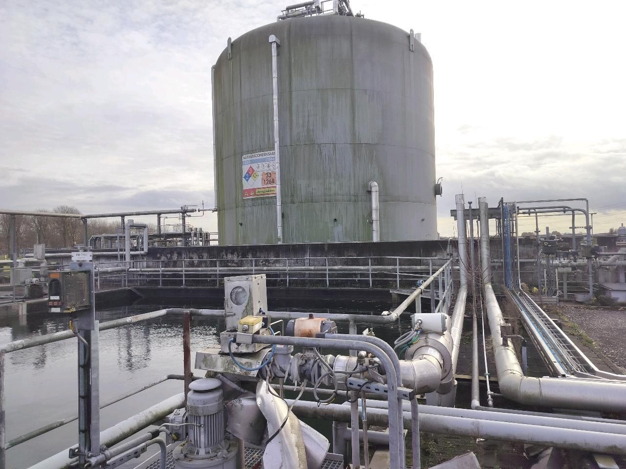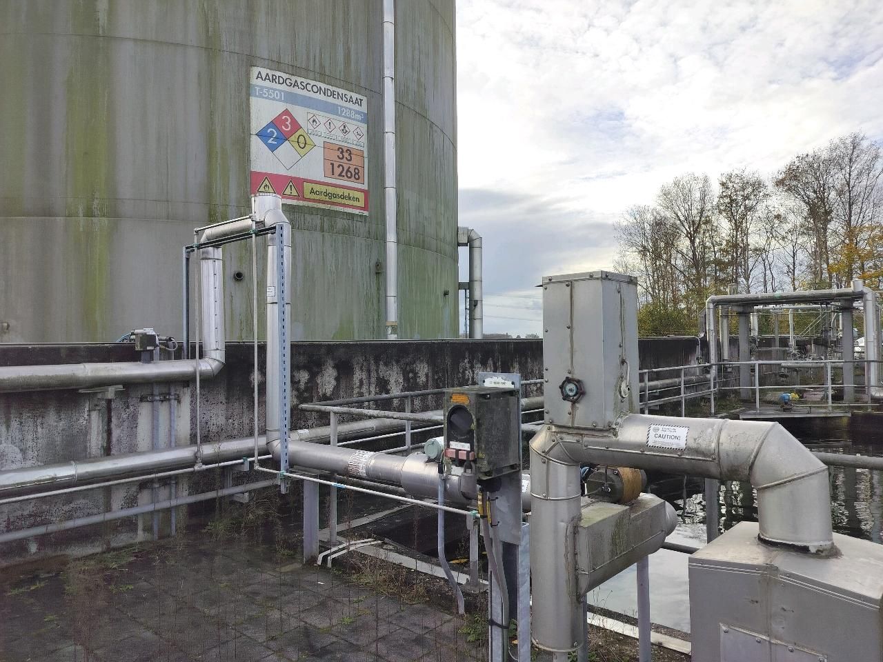 The tank is installed within a full concrete bund system providing environmental containment. Surrounding the tank is the condensate handling and pump area, which includes transfer pumps, piping manifolds, control valves, and instrumentation—enabling safe loading/unloading to downstream processing or export lines.