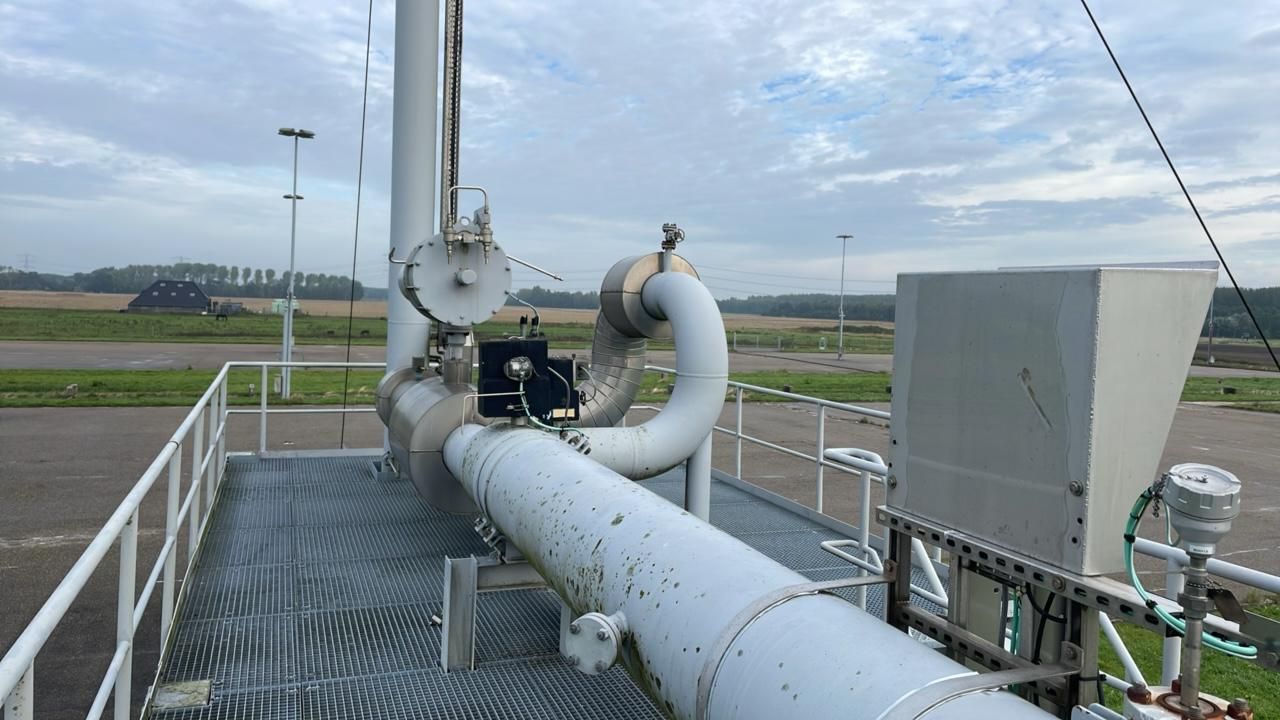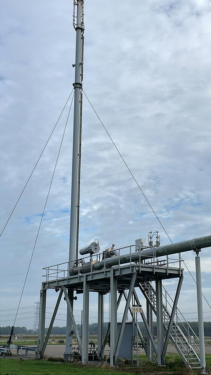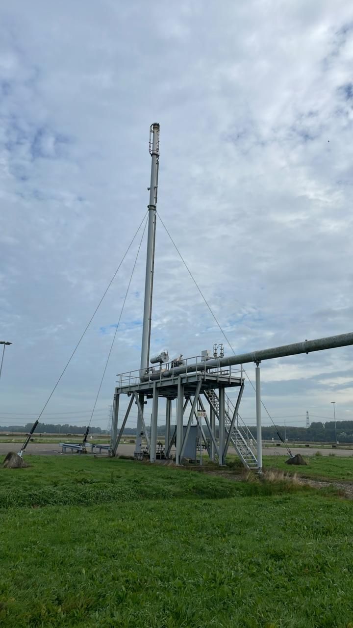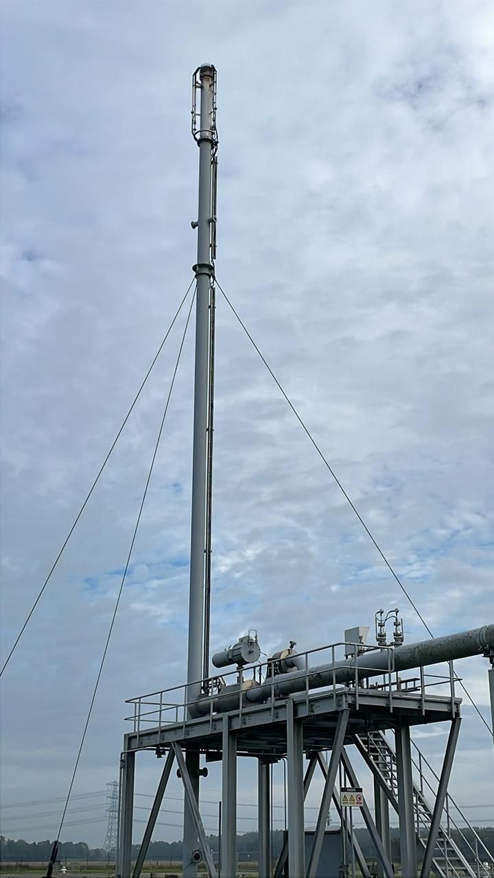 The system includes a tall, guy-wire–stabilized flare tower engineered for high-wind and outdoor duty. The elevated flare tip provides clean, smokeless burning, while the robust steel base platform offers secure access for maintenance and instrumentation.