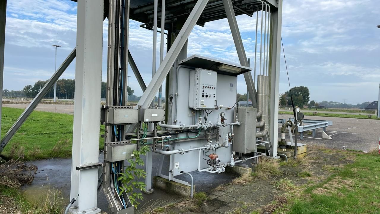The skid below the structure houses control valves, pilot gas equipment, flame front generator lines, and ignition circuitry. Heavy-duty construction, industrial cabling, and stainless tubing demonstrate a system built for long-term, continuous operation.