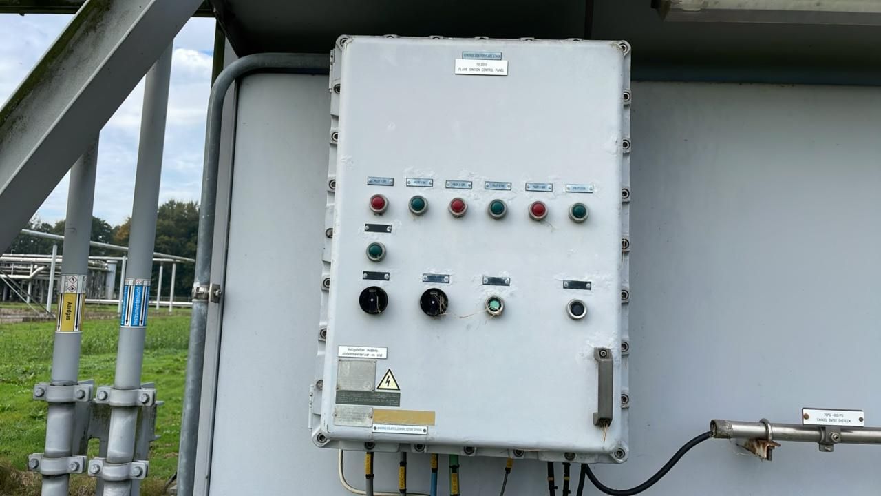 A John Zink FEC Panel (fabricated 2001) provides ignition control, flame monitoring, pilot system regulation, and overall flare safety management. Integrated GE DigitalFlow transmitters ensure accurate flow measurement and reliable monitoring of gas entering the flare system—ideal for process safety and environmental compliance.