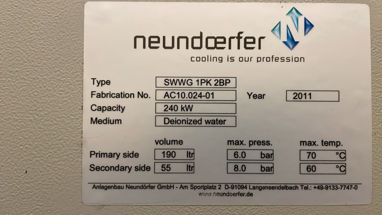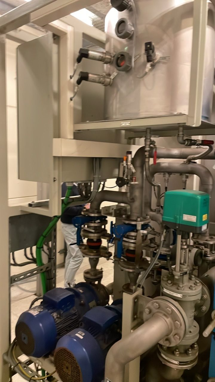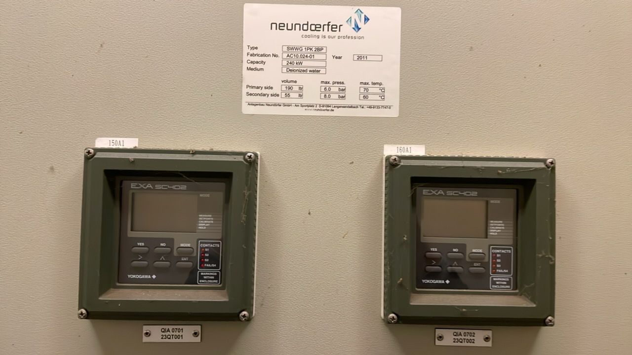 The system includes Neundörfer cooling control panels, used for managing a 240 kW deionized-water cooling system. These cabinets incorporate Yokogawa EXA SC402 controllers, responsible for accurate temperature control, alarm management, pump sequencing, and safety interlocks. The cabinets are configured for dual-circuit cooling (primary 190 L / secondary 55 L), ensuring stable operating temperatures for VSDS and harmonic filter equipment.