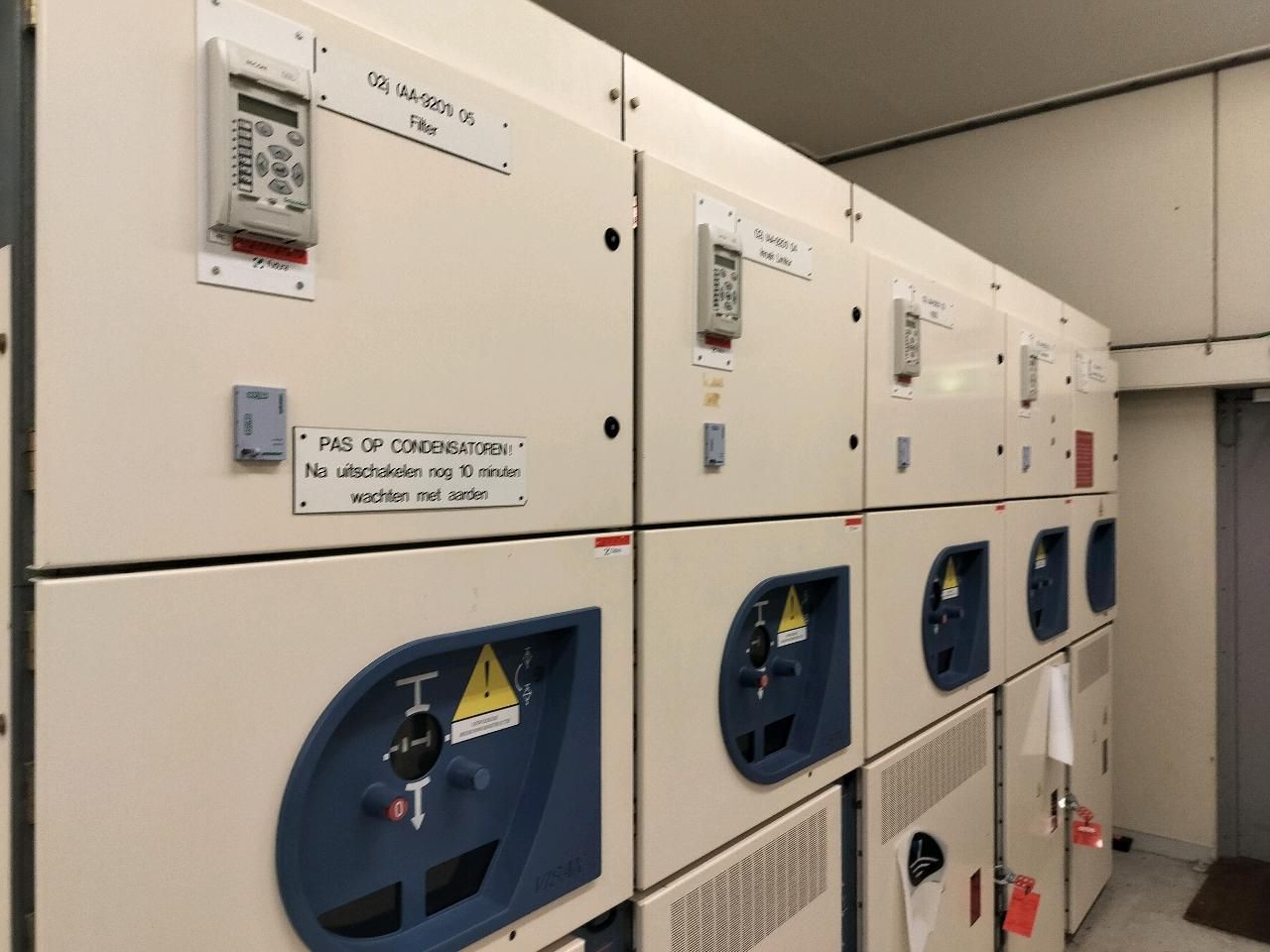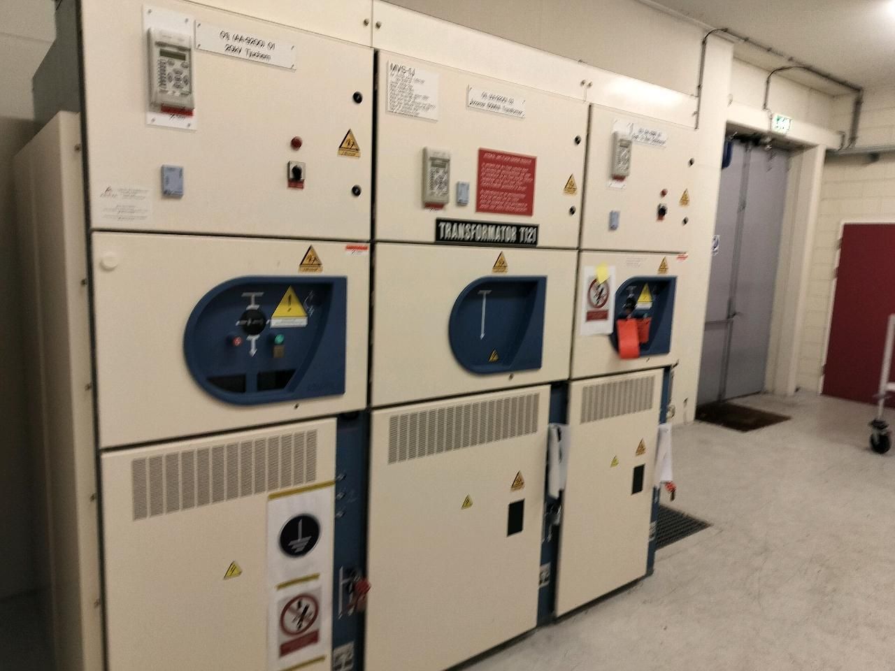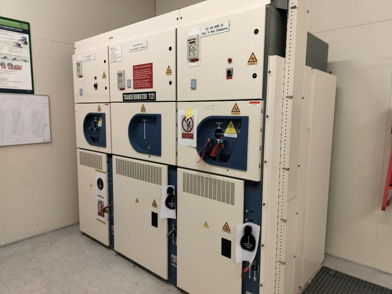 Indoor medium voltage switchgear panels for transformer distribution, complete with protection and control units in a dedicated transformer room.
